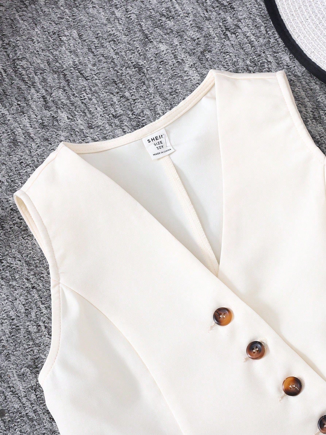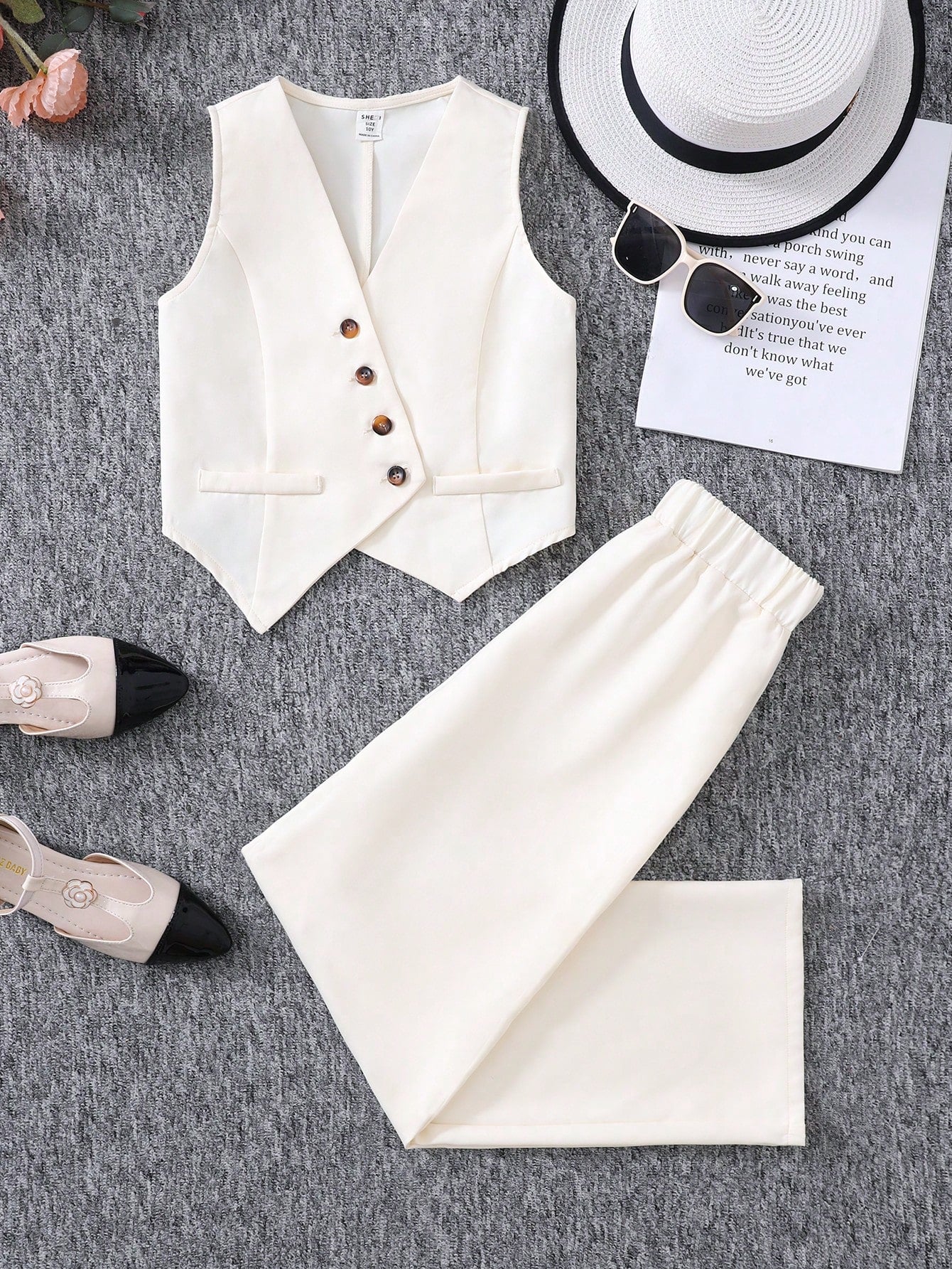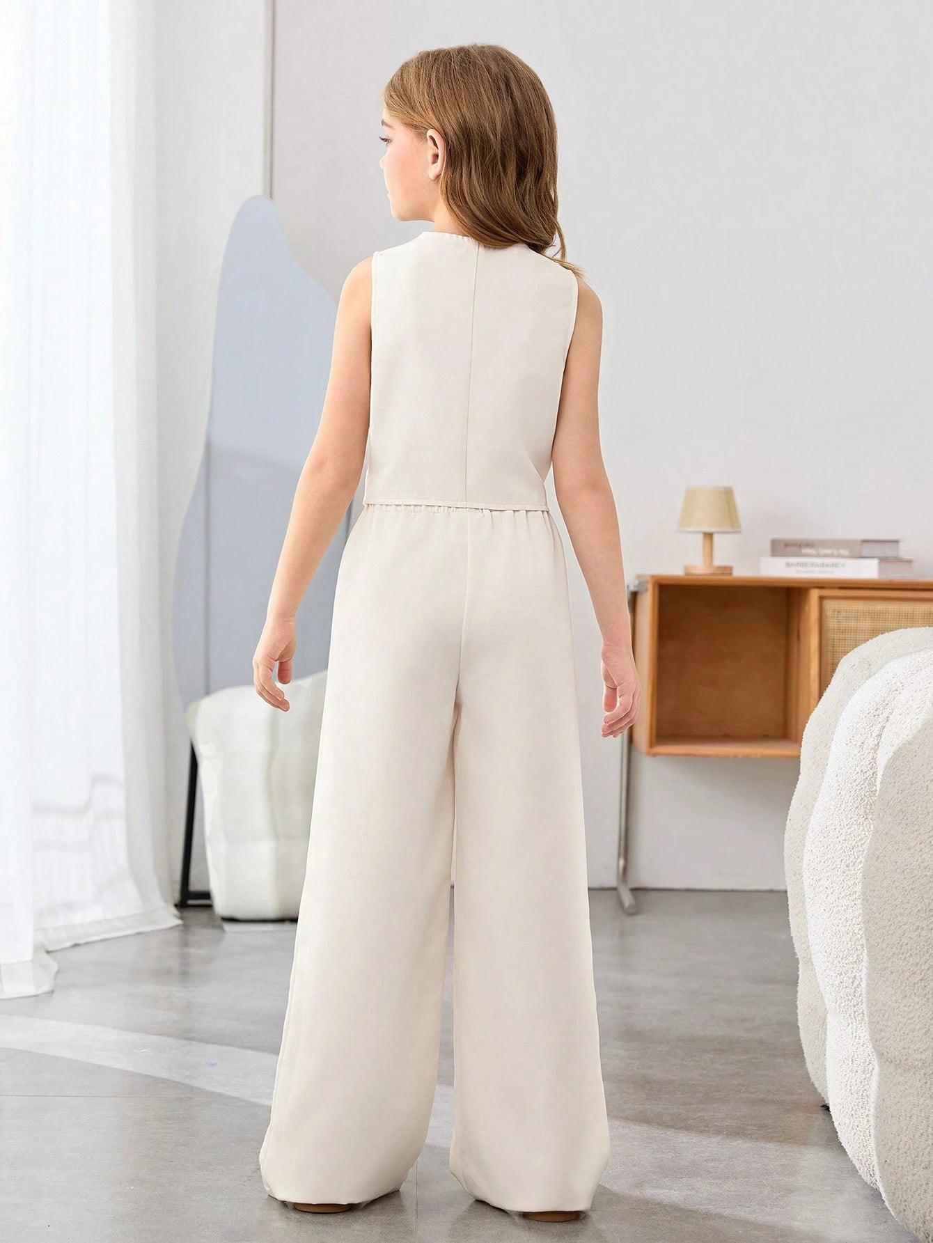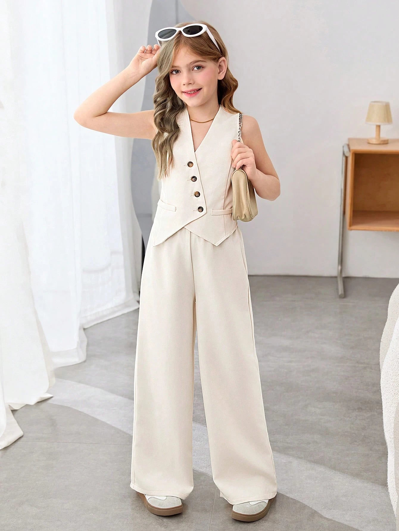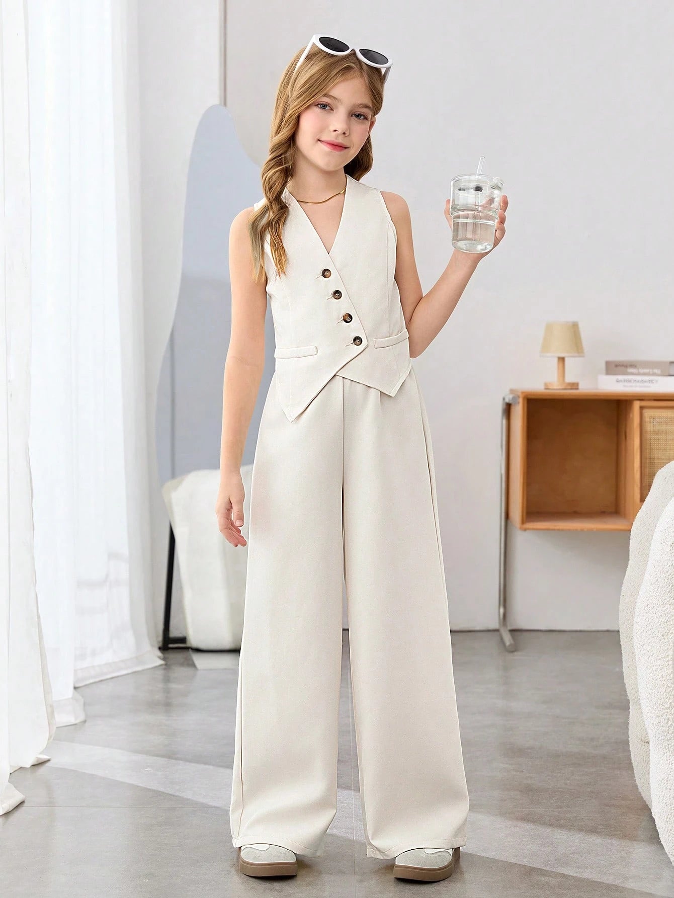 Tipo de Estampado : LisoPantalón Forro : Sin ForroColor : BeisEstilo : EleganteDetalles : Botón, Doble botonadura, BolsilloEscote : SolapaTipo de ajuste : RegularPantalón Longitud : LargoTops Longitud de la Manga : sin mangasTops Longitud : NormalPantalón Material : PoliésterPantalón&Tops Composición : 94% Poliéster,6% ElastanoInstrucciones de Cuidado : lavadora o limpieza en seco profesionalTransparente : NoTejido : No-ElásticoForrado Para Aportar Calidez : No