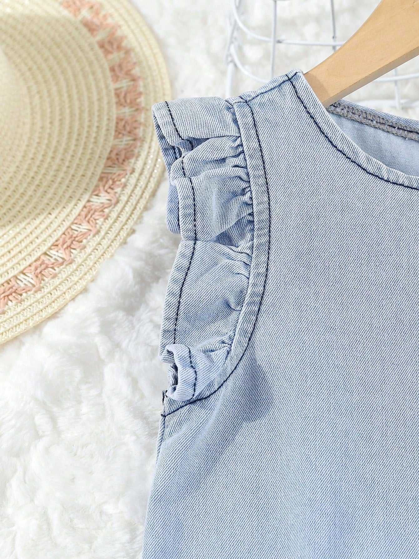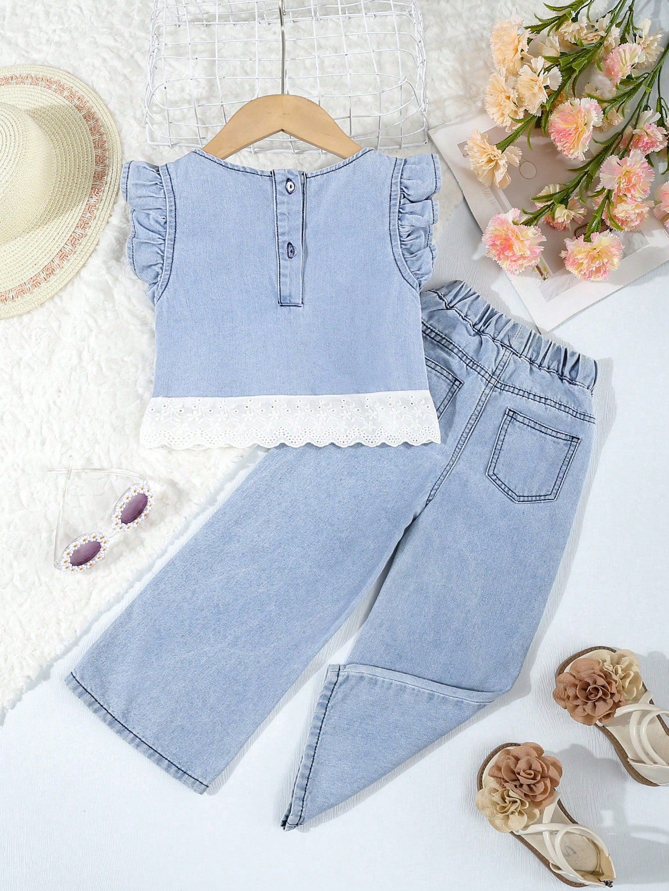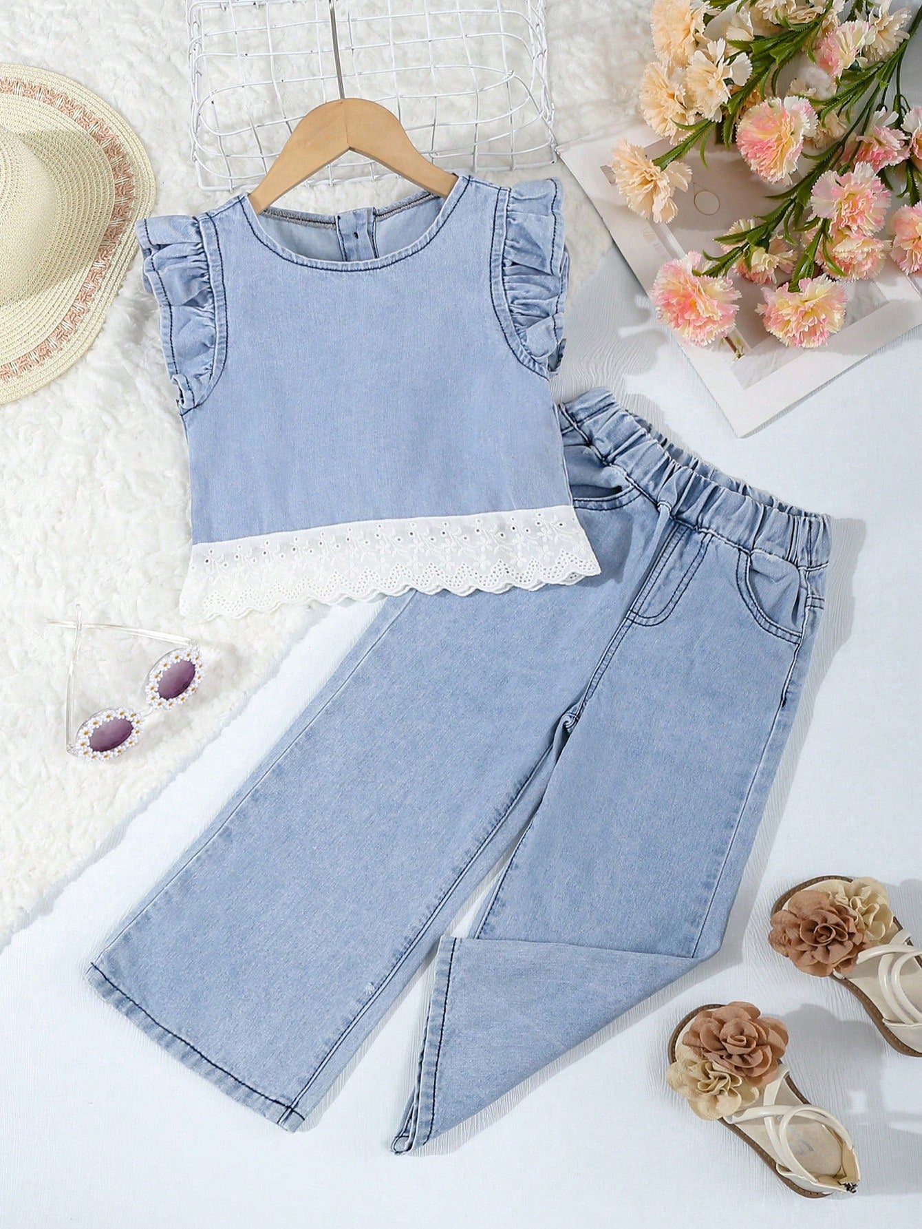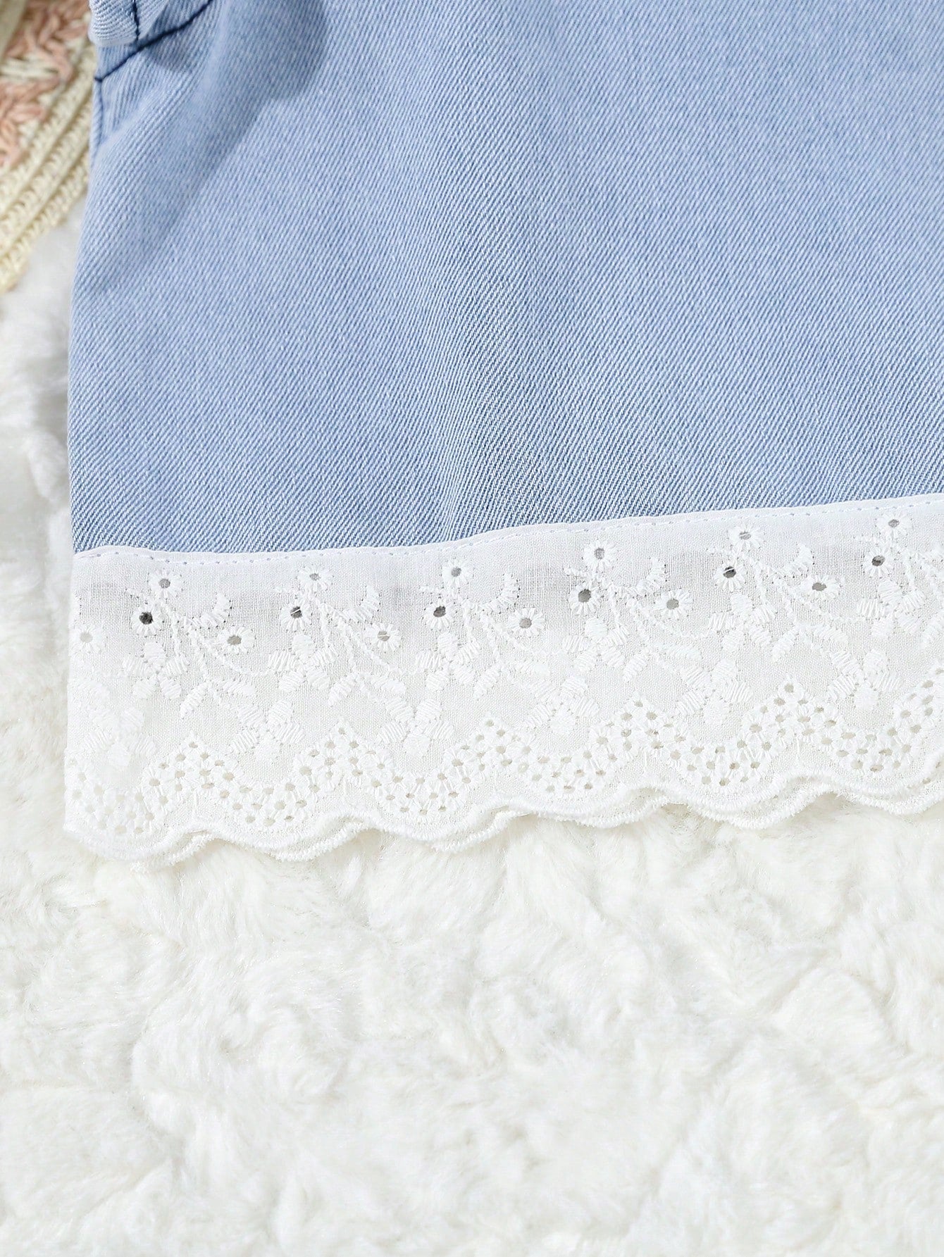 Escote : cuello redondoForrado Para Aportar Calidez : NoTipos de Manga : Manga con volanteTipo de Estampado : LisoPantalón Forro : ForradoDetalles : Encaje en contraste, Bolsillo, VolanteColor : Lavado ligeroTipo de top : Top con tirantesTipo de Bottom : PantalónTops Longitud : CortoPantalón Longitud : LargoTipo de ajuste : sueltoTops Material : MezclillaTops&Pantalón Composición : 60% Algodón,25% Poliéster,15% ViscosaInstrucciones de Cuidado : lavadora o limpieza en seco profesionalTransparente : NoTejido : No-Elástico