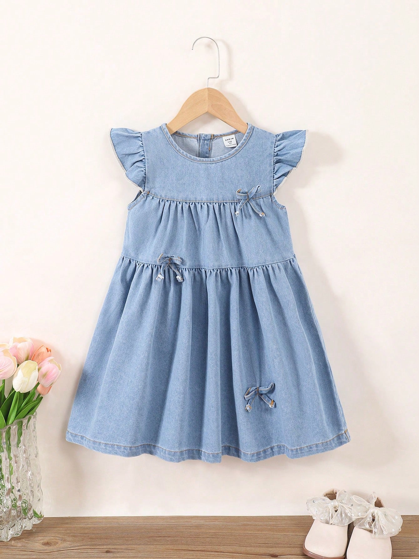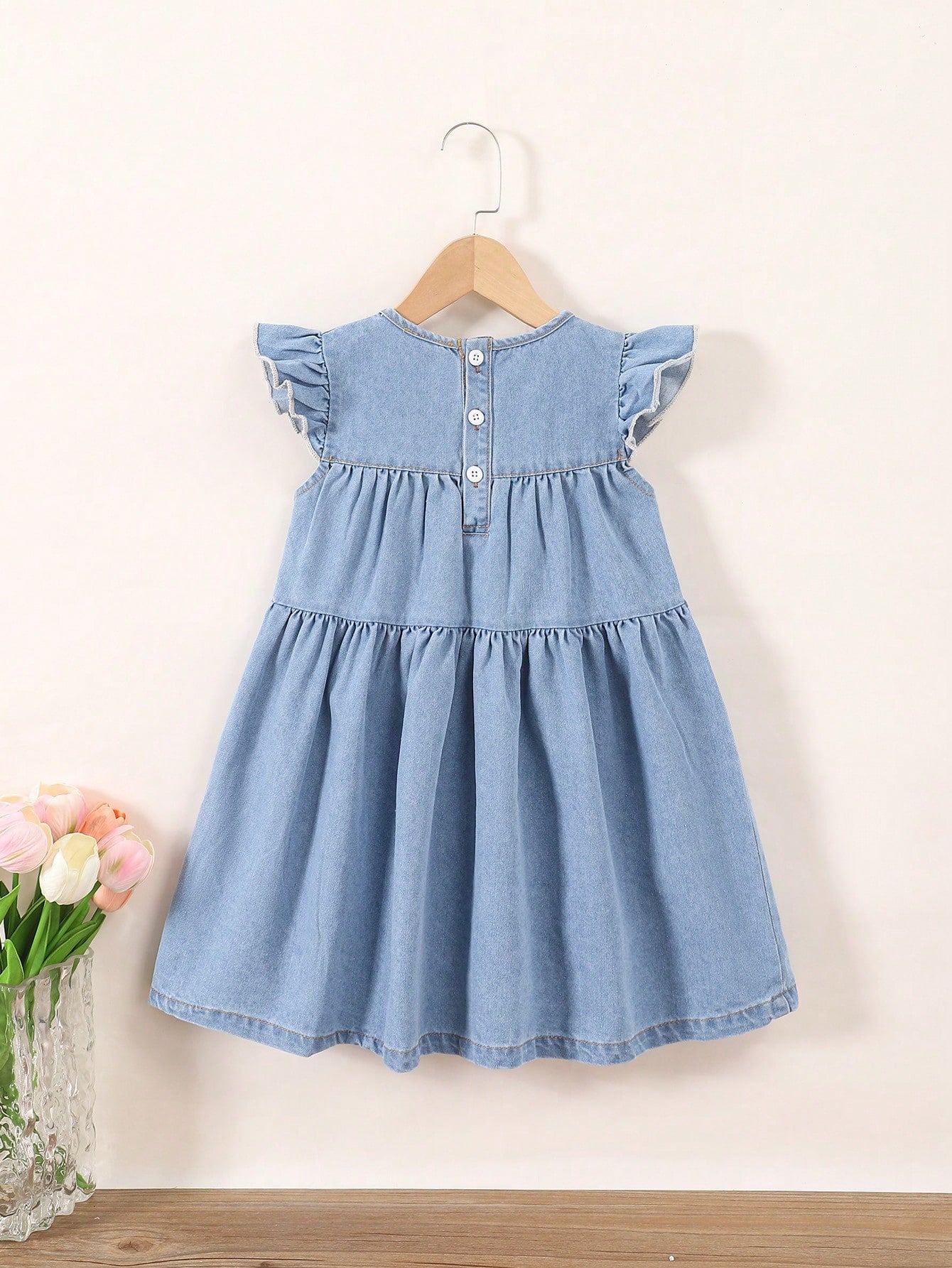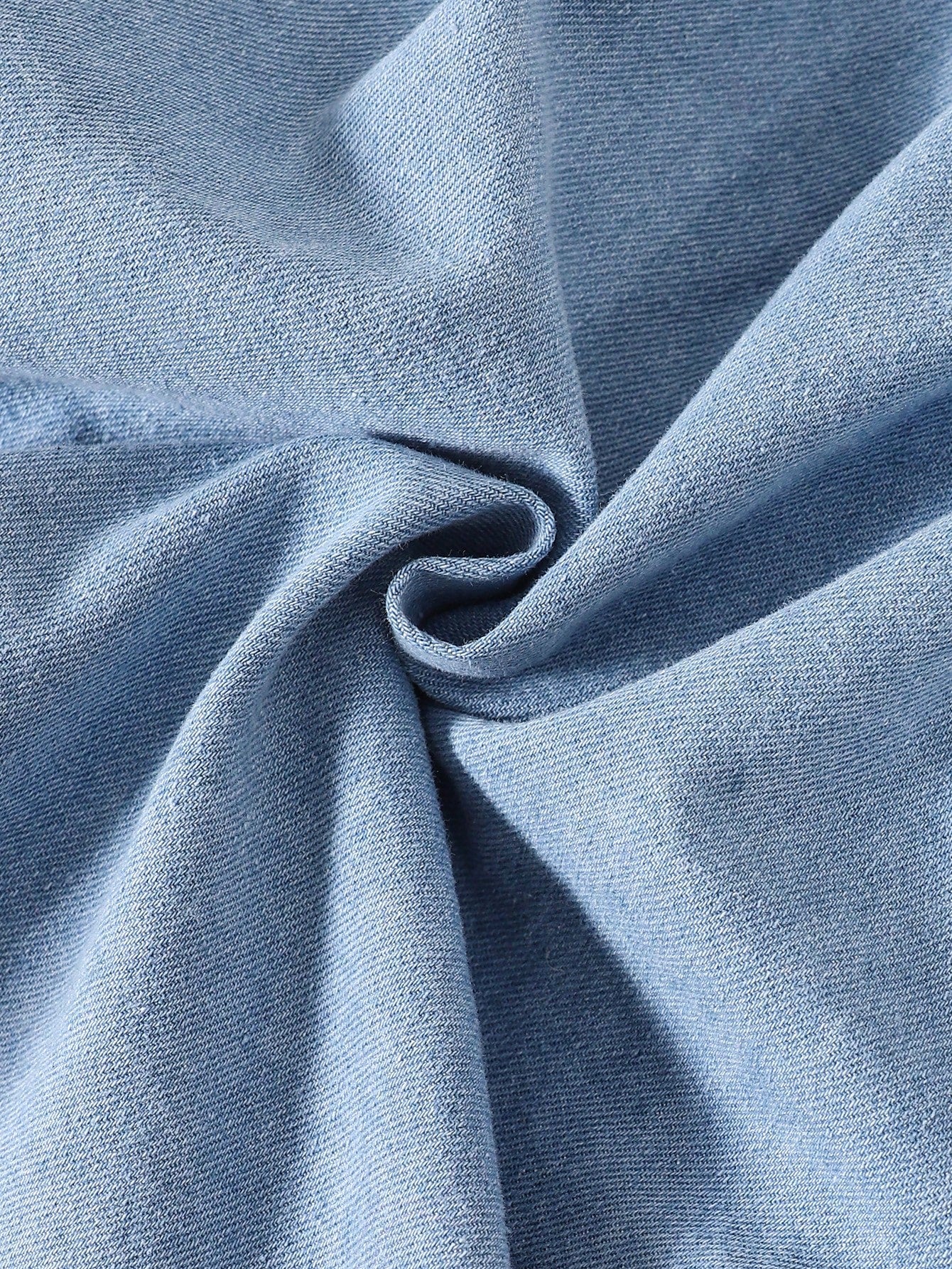 Neckline : Round NeckSleeve Type : Flounce SleeveHem Shaped : FlaredWaist Line : High WaistType : SmockDetails : Button, RuffleLined For Added Warmth : NoPattern Type : PlainColor : BlueSleeve Length : SleevelessFit Type : Regular FitLength : ShortFabric : Non-StretchMaterial : DenimComposition : 81% Cotton, 15% Polyester, 4% ViscoseCare Instructions : Hand wash,do not dry cleanSheer : NoPockets : No