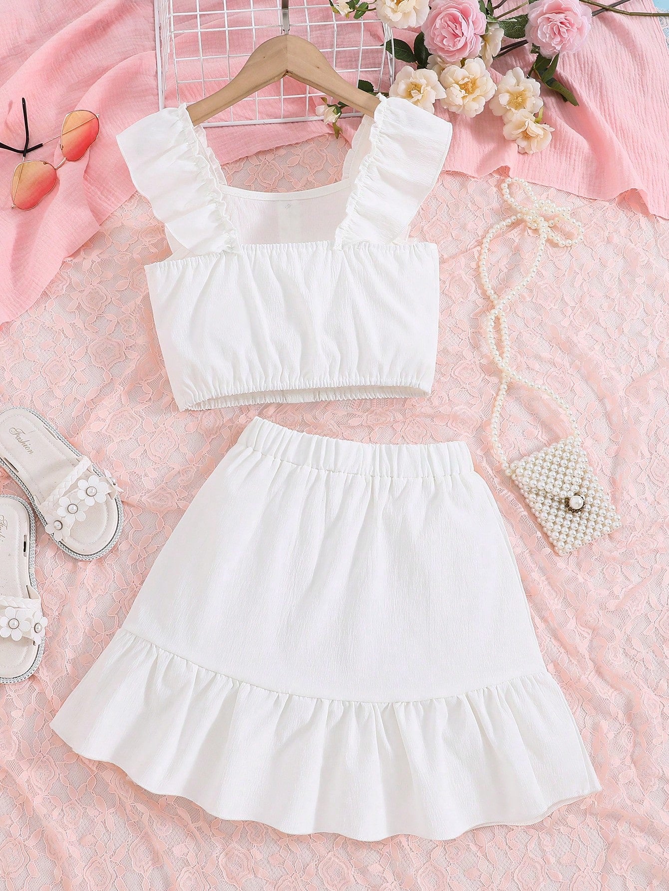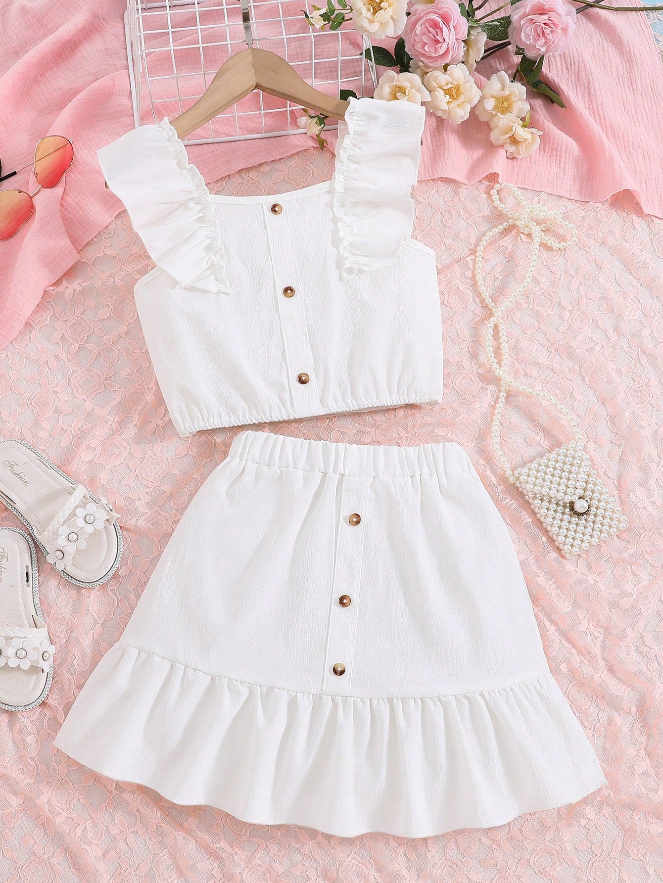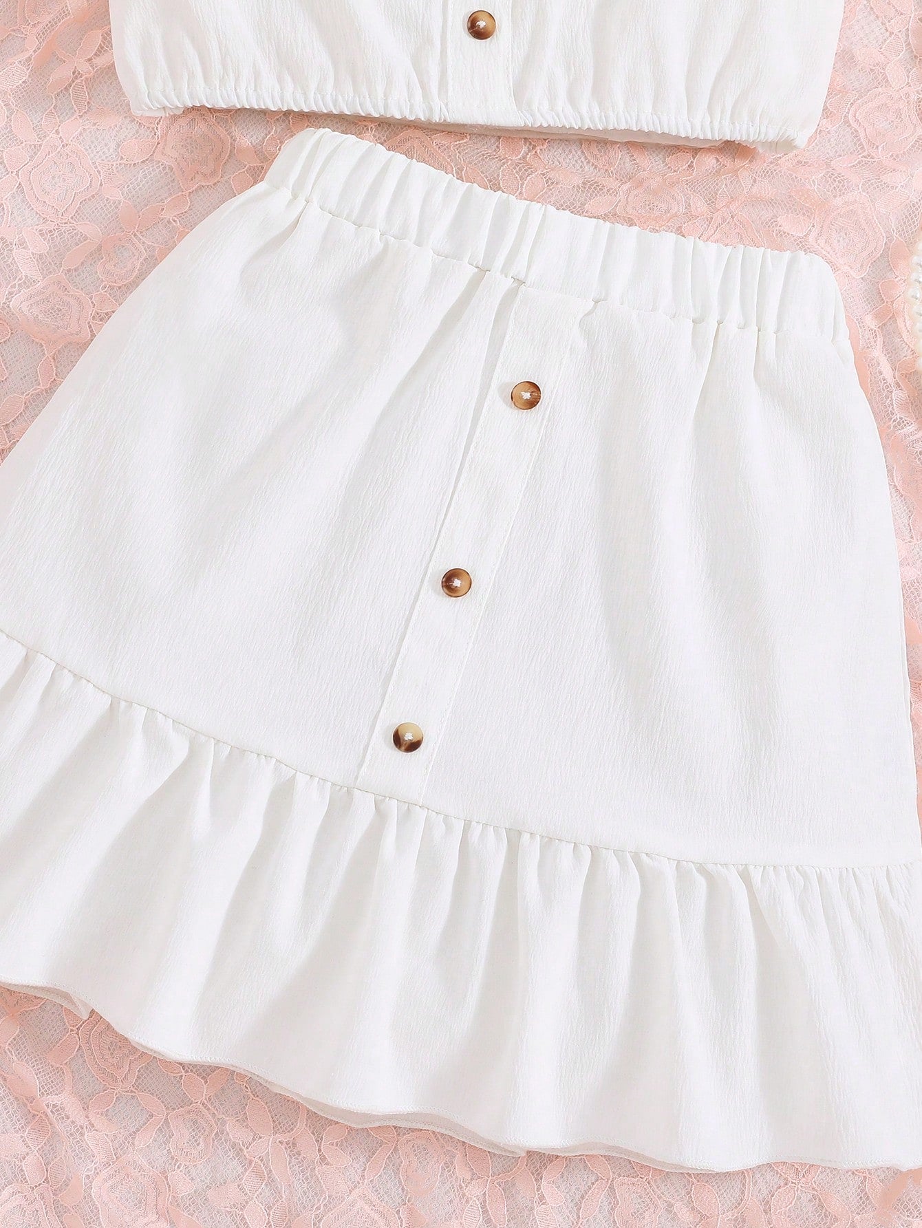 Escote : escote cuadradoEstilo : EleganteTipos de Manga : Manga con volanteTipo de Estampado : LisoNúmero de piezas : Set de 2 PiezasDetalles : Botón, VolanteColor : BlancoTipo de top : BlusaTipo de Bottom : FaldasTops Longitud : CortoTipo de ajuste : RegularTops Material : TelaTops&Faldas Composición : 100% PoliésterInstrucciones de Cuidado : lavadora o limpieza en seco profesionalTransparente : SemitransparenteTejido : No-Elástico