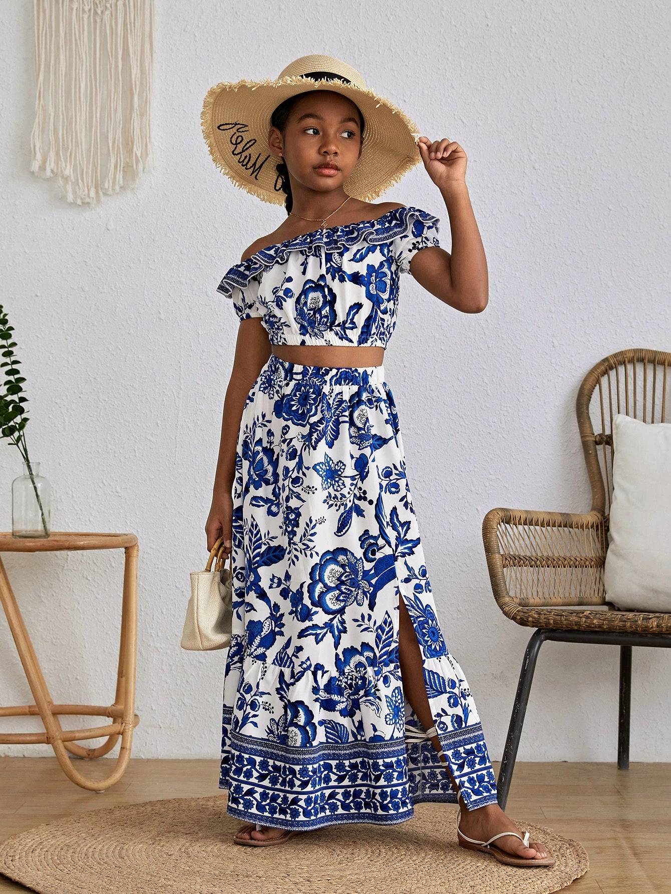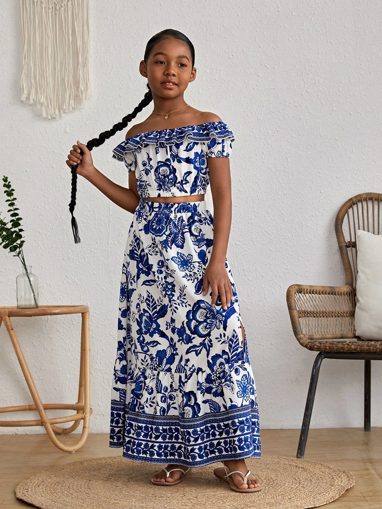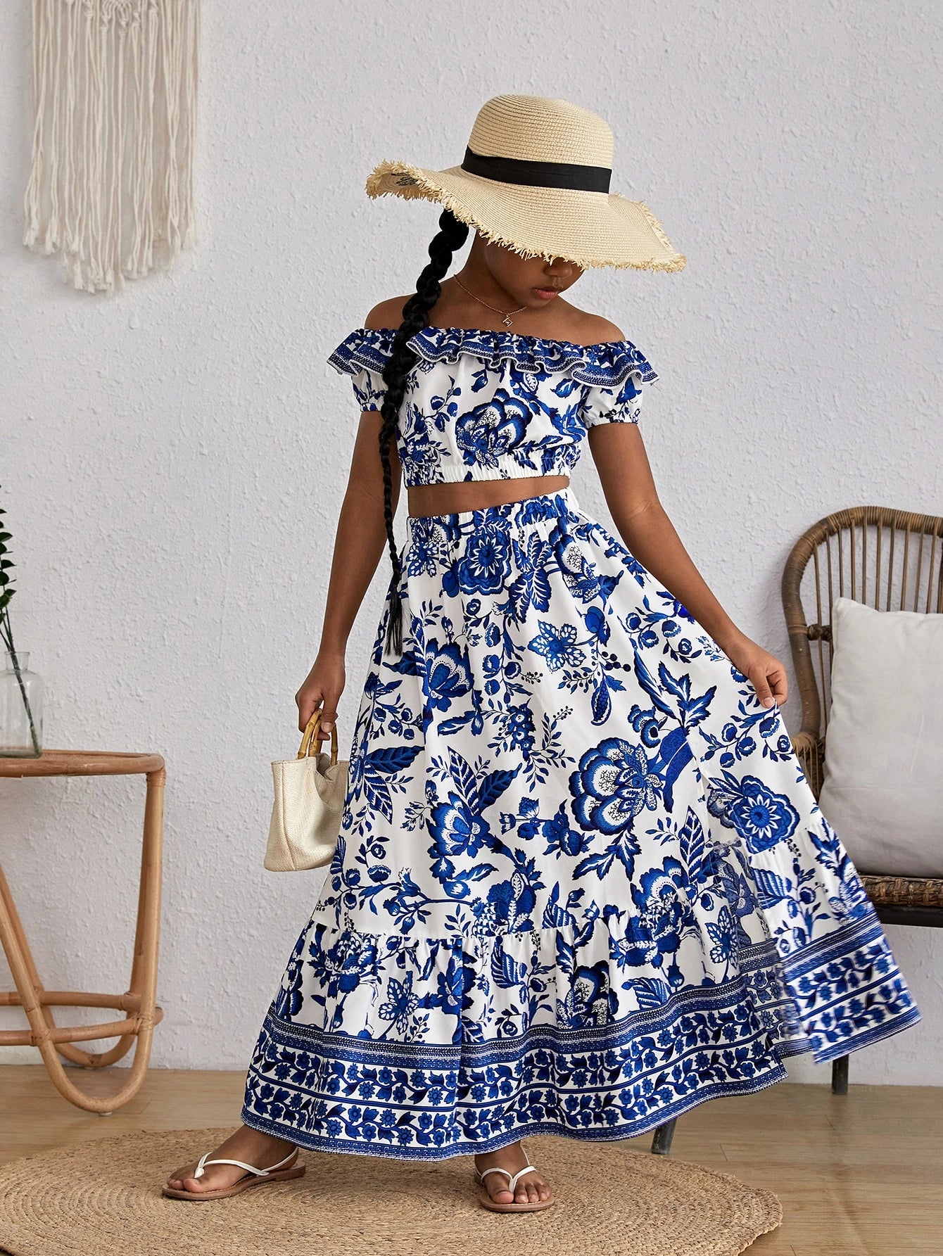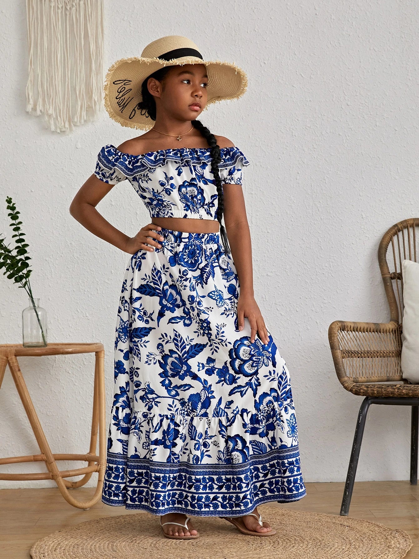 Características Especiales : Materiales RecicladosEscote : Hombros descubiertosEstilo : EleganteTipos de Manga : manga farolTipo de Estampado : Floral, PlantasNúmero de piezas : Set de 2 PiezasDetalles : VolanteColor : Azul y blancoTipo de top : BlusaTipo de Bottom : FaldasTipo de ajuste : RegularFaldas Longitud : LargoTops Longitud de la Manga : manga cortaTops Longitud : CortoTops Material : Tela tejidaInstrucciones de Cuidado : lavadora o limpieza en seco profesionalTransparente : NoTejido : Elástico LigeroTops&Faldas Composición : 91% Poliéster,9% Elastano