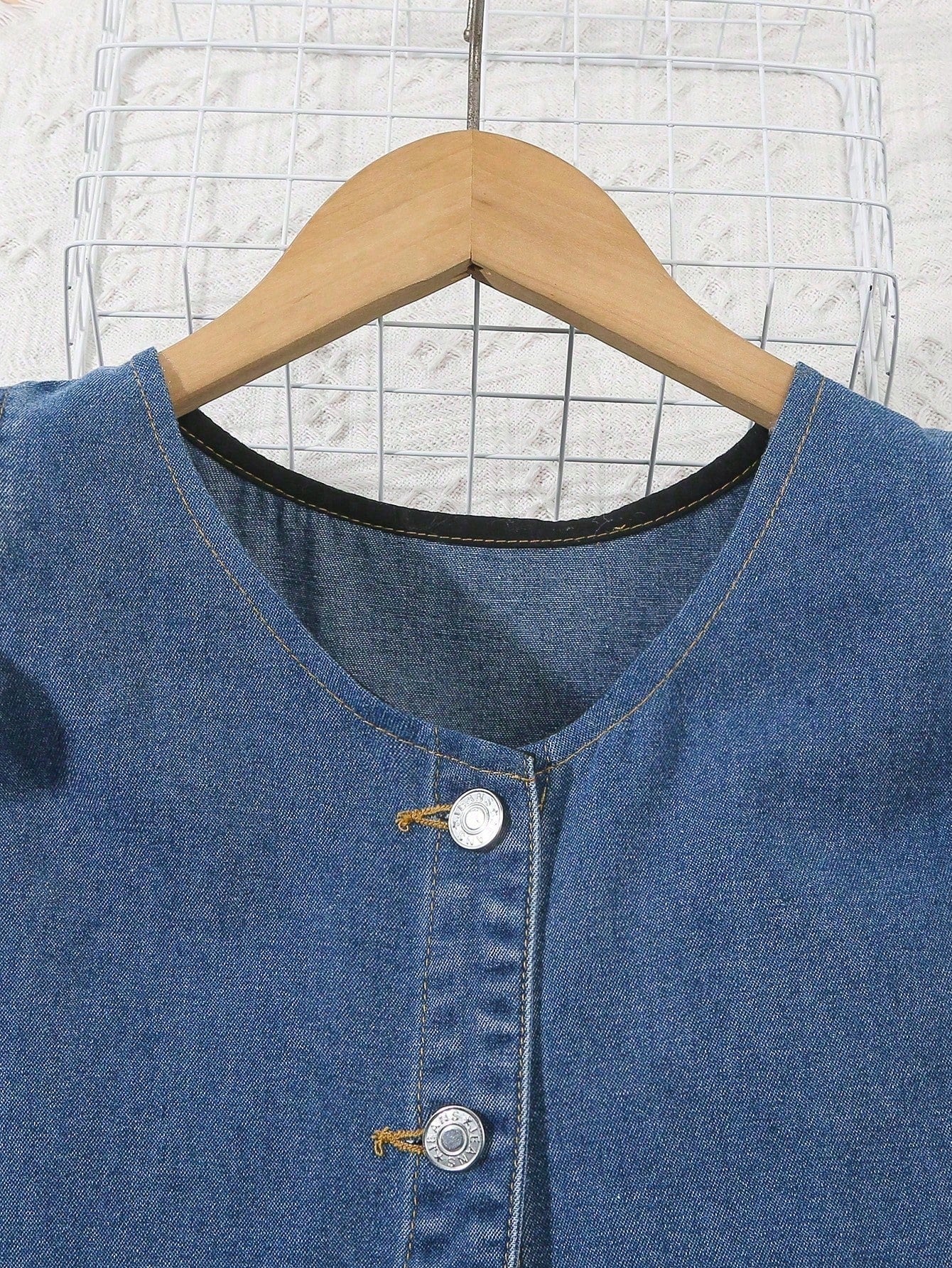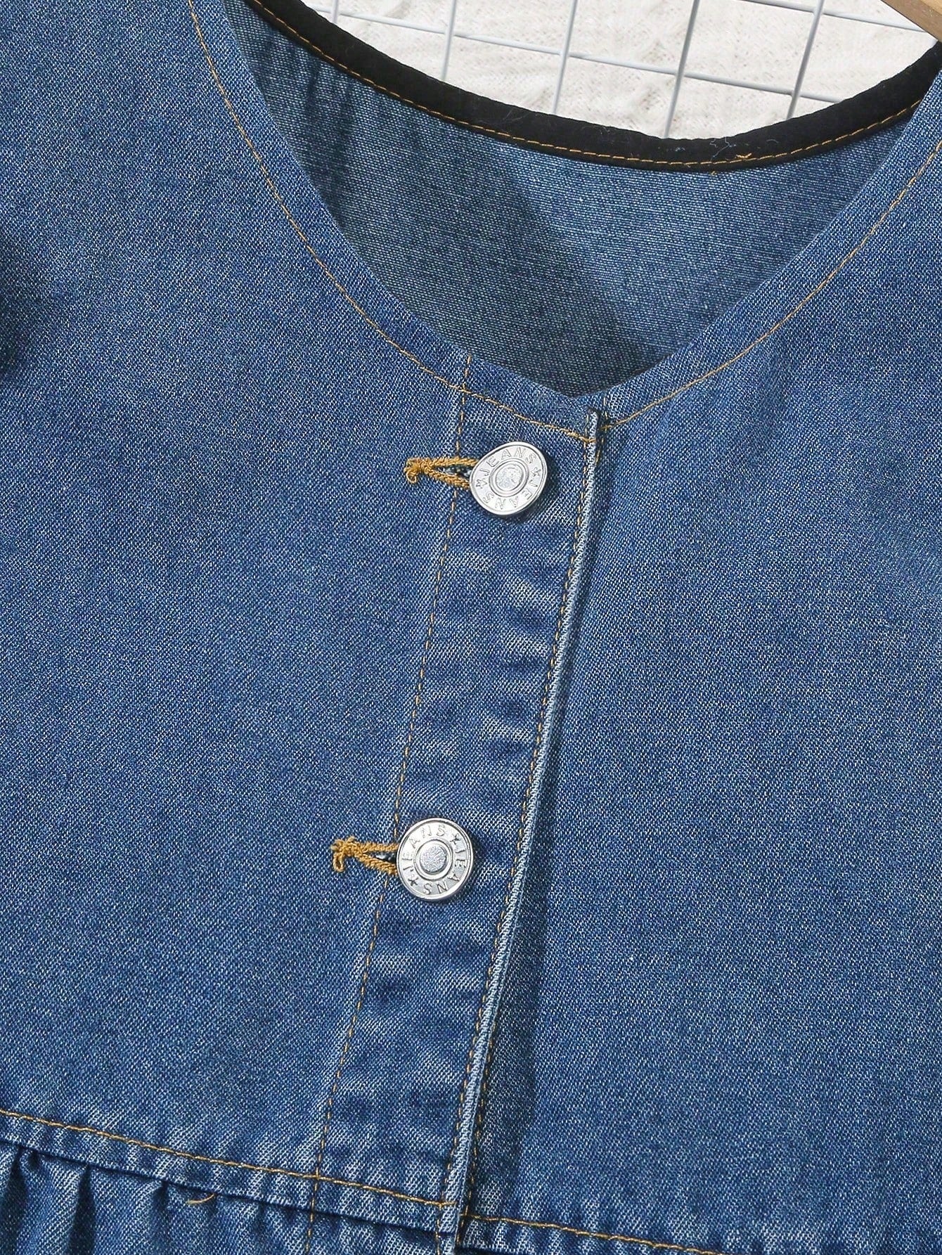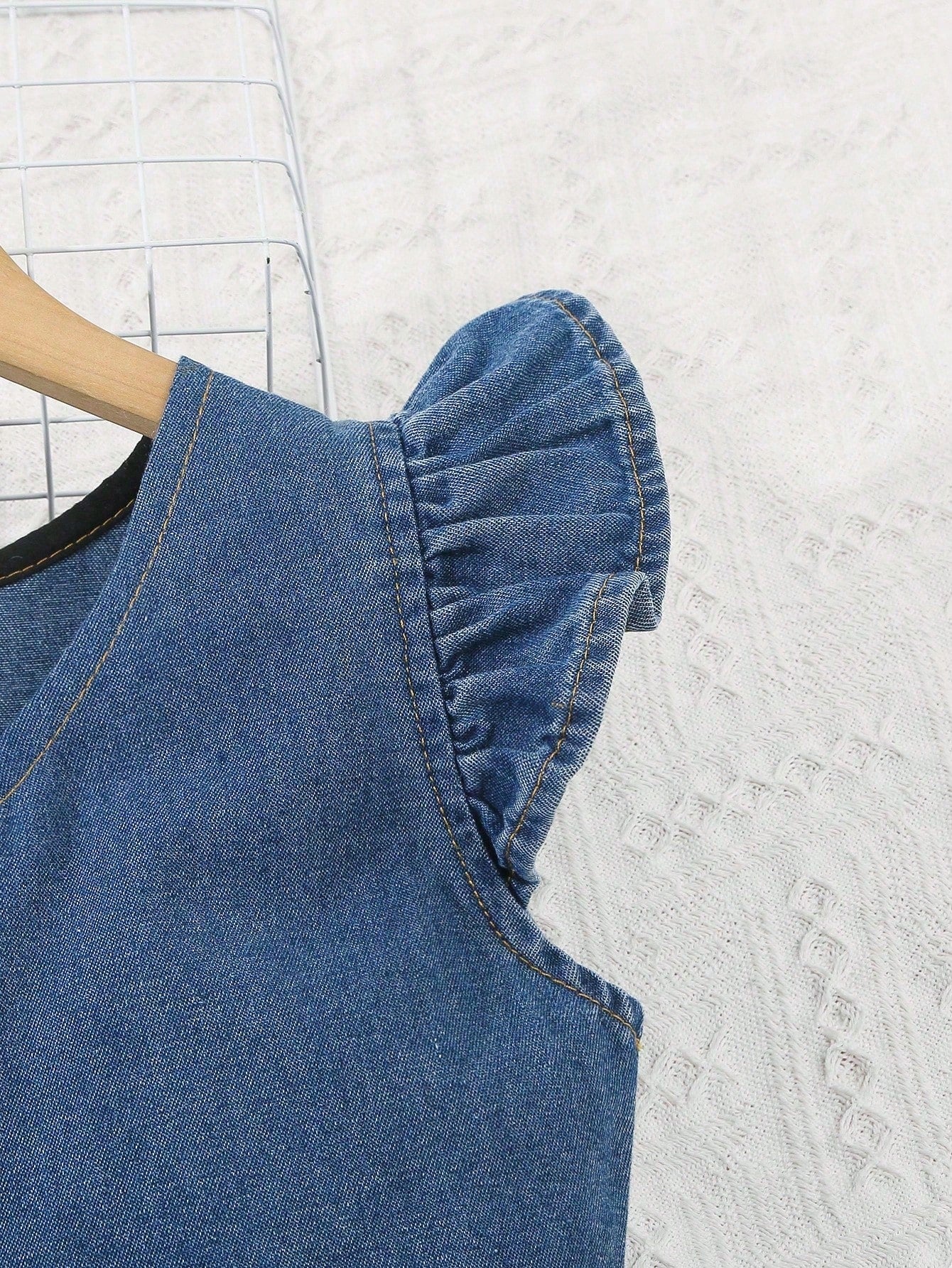 Línea del Talle de la Cintura : Talle altoCorte del bajo : A capasEscote : cuello en 'v' o picoForrado Para Aportar Calidez : NoTipo : SmockTipos de Manga : Manga con volanteTipo de Estampado : LisoDetalles : Botón, VolanteColor : Azul lavado medioLongitud de la Manga : sin mangasTipo de ajuste : RegularLongitud : CortoTejido : No-ElásticoMaterial : MezclillaComposición : 63% Algodón, 21% Poliéster, 10% Viscosa, 3% Lyocell, 2% poliamida, 1% AcrílicoInstrucciones de Cuidado : lavadora o limpieza en seco profesionalTransparente : No