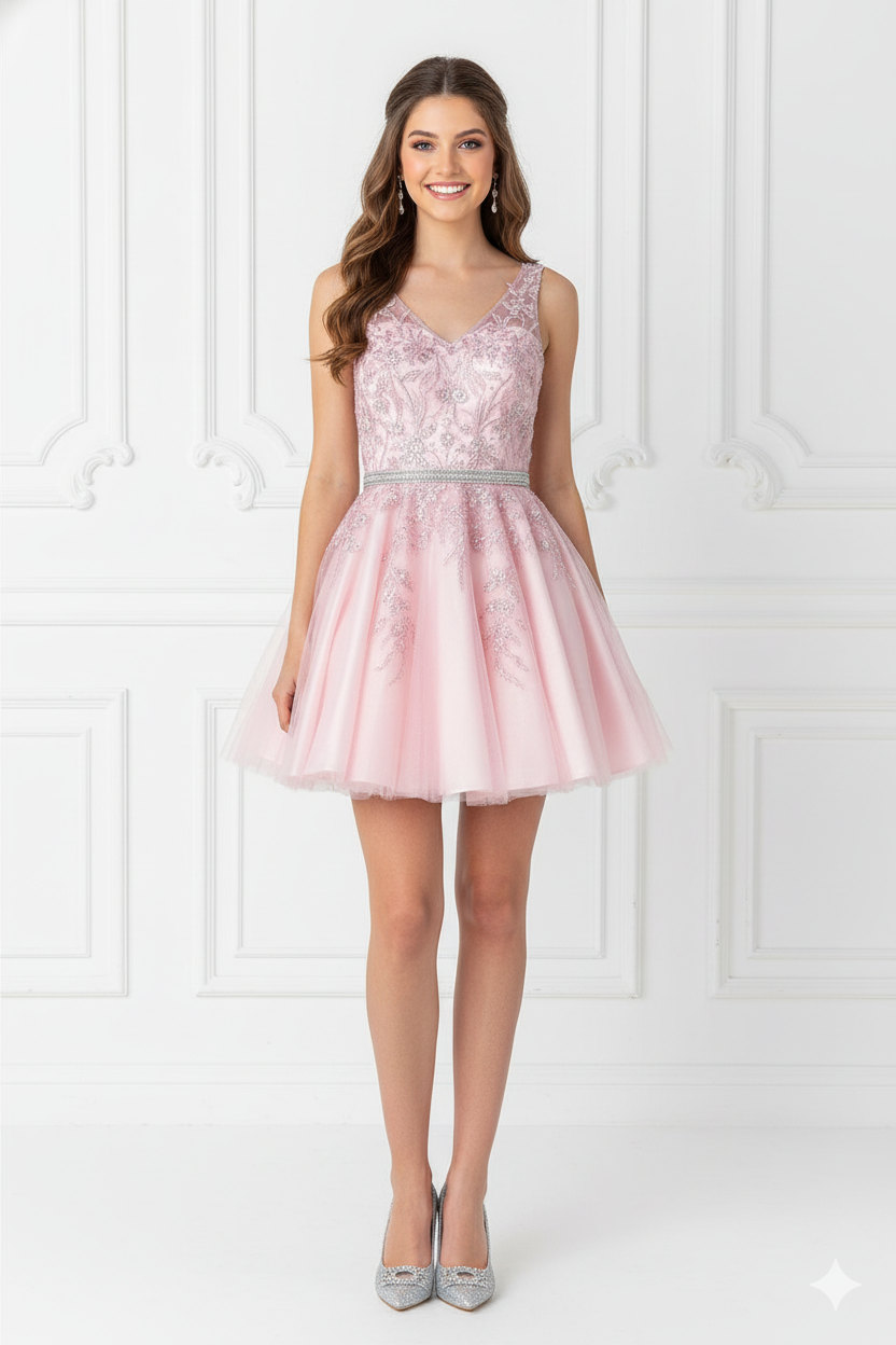 Con un corpiño transparente con escote en V y forro de corazón, el corpiño sin mangas está decorado con un bordado floral y detalles de cuentas. El cinturón de cuentas realza tus curvas naturales. La espalda ilusión luce un escote en V semiabierto y se cierra con una cremallera central, mientras que la falda presenta una silueta en A con un bajo corto.