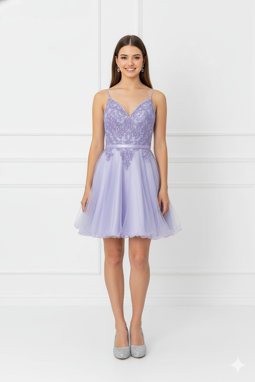 Elegante vestido de bienvenida con delicado bordado en el corset, escote en V pronunciado, falda vaporosa de tul y el cual puedes acompañarlo con tacones con destellos de brillo