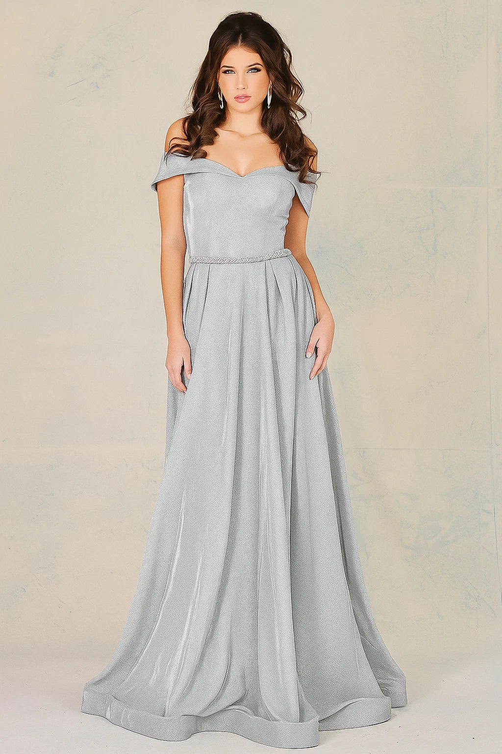 Vestido de fiesta con acabado metálico, diseño en línea A y elegante escote de hombros descubiertos